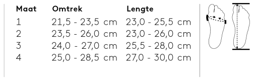 Meet zowel de lengte van de voet als de omtrek van de voorvoet terwijl er gewicht op de voet wordt gezet. Kies vervolgens de juiste maat volgens onderstaande tabel: