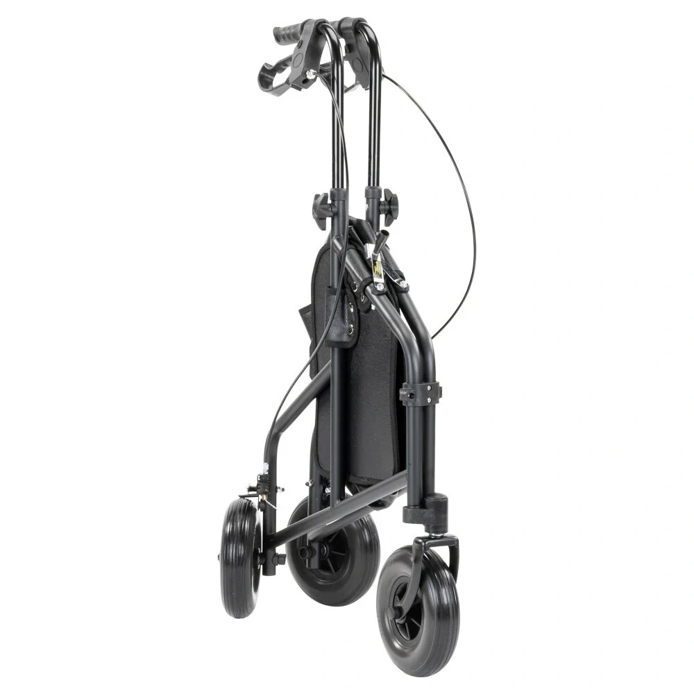 Het frame is eenvoudig inklapbaar, waardoor de rollator compact kan worden opgeborgen wanneer deze niet in gebruik is. Bij het inklappen dient het metalen mandje met dienblad verwijderd te worden. De tas kan wel aan de rollator blijven hangen.