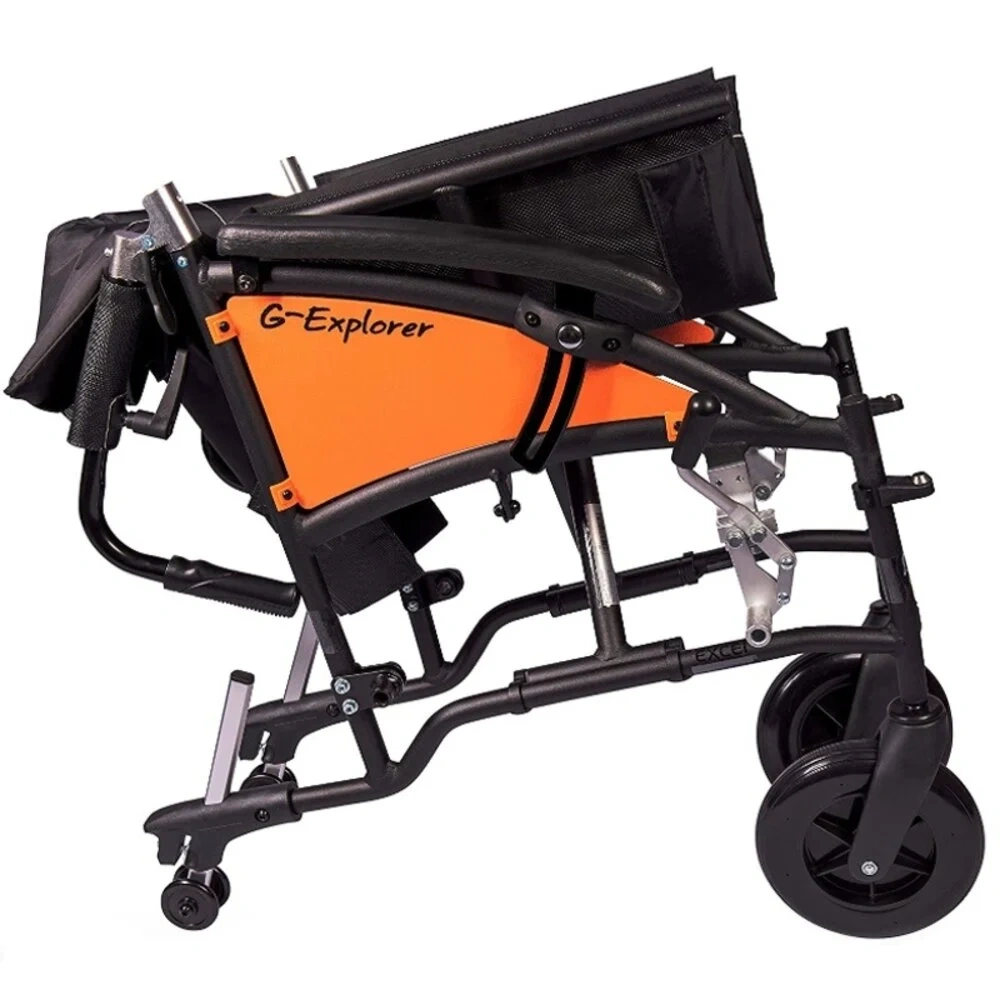 De in hoogte verstelbare duwhandvatten en half neerklapbare rugleuning zorgen voor een ergonomische en comfortabele zitpositie. De afneembare voetsteunen en plooibare bekleding maken het onderhoud en transport eenvoudig. Dankzij het lage gewicht en de vouwbare constructie neemt u de G-Explorer zonder moeite mee in de auto of het openbaar vervoer.