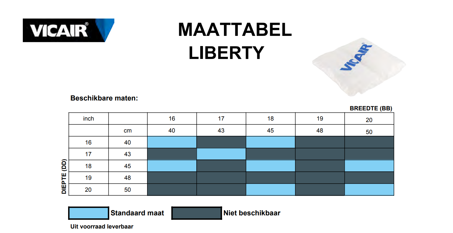 Het kussen heeft een dikte van 5 cm en weegt gemiddeld slechts 350 gram. Het is geschikt voor gebruikers tot 150 kg en verkrijgbaar in meerdere standaardmaten. De Vicair Liberty is latexvrij en wordt geleverd met 24 maanden garantie. Het kussen zelf is niet machinewasbaar, maar de bijgeleverde Comfair Cover of Incotec Cover kan wel in de wasmachine worden gereinigd tot 60 °C en is eveneens latexvrij.
