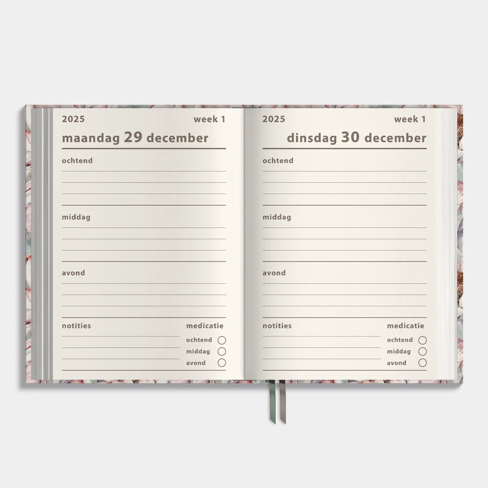 De zorgagenda loopt van januari tot en met december 2026 en biedt voor elke dag een eigen pagina. Elke dag is overzichtelijk ingedeeld in drie dagdelen: ochtend, middag en avond. Hierdoor kunnen afspraken, taken en bijzonderheden helder worden genoteerd. Onderaan elke pagina vind je extra ruimte voor notities én een afvinklijst voor medicatie. De grote, vetgedrukte letters en cijfers zorgen voor optimale leesbaarheid.