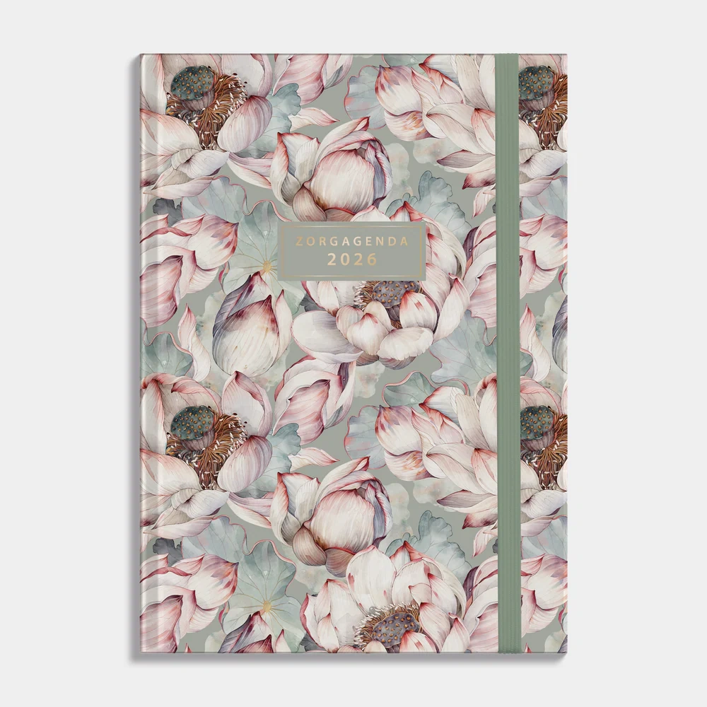 De A4 agenda heeft een elegante hardcover met een dessin van witte lotusbloemen op een grijsgroene achtergrond. De zachte soft-touch afwerking zorgt voor een premium gevoel. De tekst Zorgagenda 2026 is uitgevoerd in glanzende goudfolie voor een luxe uitstraling. Daarnaast bevat de agenda zwaar crèmekleurig papier, twee leeslinten en achterin een opbergenvelop voor losse documenten. In deze envelop vind je ook zes vellen met handige gekleurde planstickers voor extra structuur en overzicht.